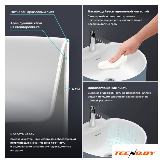 Материал, из которого изготовлен умывальник, — акрил, известный своей прочностью и устойчивостью к механическим повреждениям. В дополнение к этому, поверхность умывальника имеет антибактериальное покрытие, обеспечивающее гигиеничность и легкость ухода. Вы забудете о постоянной чистке и стремлении сохранить первоначальный вид — Wellsee Chalice Perfection заботится об этом за вас.