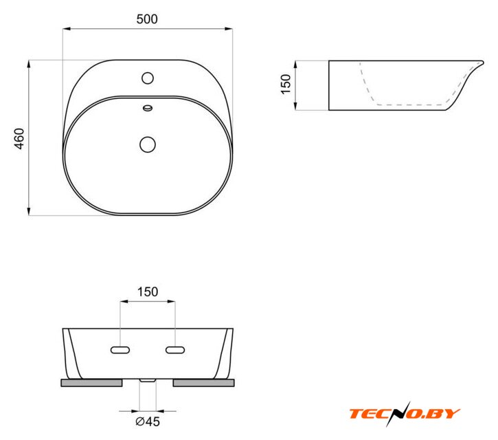 60x34 см, с одной чашей, накладной, фарфор, крепление на столешницу
