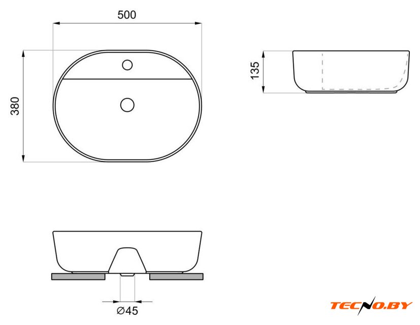 55x32 см, с одной чашей, накладной, фарфор, крепление на столешницу