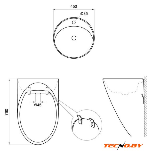 45x45 см, с одной чашей, настенный, фарфор, крепление на стену