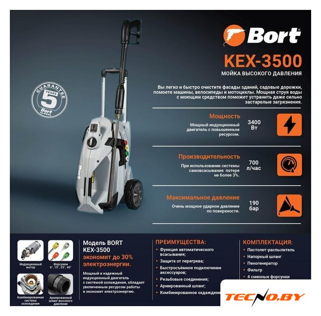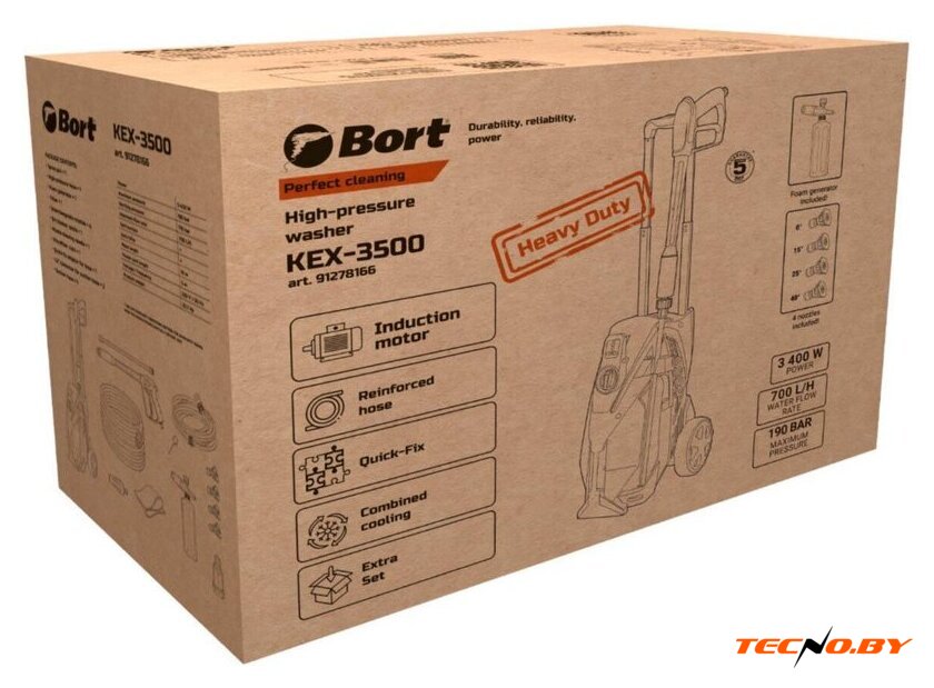 Мойка высокого давления Bort KEX-3500 обладает впечатляющей мощностью в 3 400 Вт, что делает ее идеальным инструментом для самых различных задач по очистке. С производительностью 700 литров в час и максимальным рабочим давлением 170 Бар, она легко справляется с упорной грязью и загрязнениями. Для более сложных задач предусмотрено максимальное допустимое давление в 190 Бар, обеспечивая надежную чистоту в любых условиях.