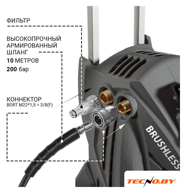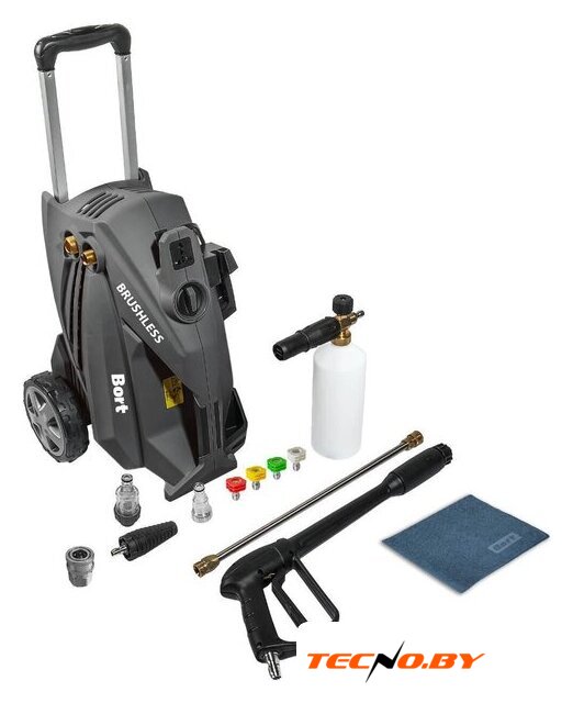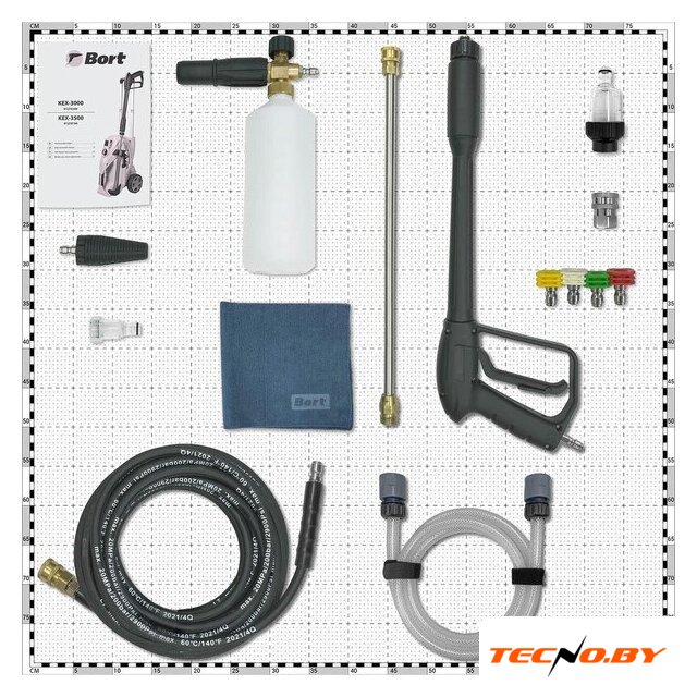Bort KEX-3500 оснащена пистолетом-распылителем и набором из четырех насадок, включая трубку (пику), что позволяет гибко адаптировать устройство под различные задачи. Для удобства использования в комплект также входит напорный шланг. Эти элементы обеспечивают разнообразие в методах очистки и требуют минимальных усилий при смене.