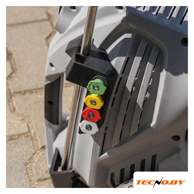 Эта электрическая мойка работает от однофазного электропитания, что значительно упрощает ее подключение и использование. Модель оснащена функцией забора воды, что позволяет использовать ресурс максимально эффективно, даже если рядом нет водопровода. Отсутствие бака для воды и моющего средства делает устройство легким и мобильным. Длина кабеля — 5 метров, а шланга — 10 метров, что обеспечивает большую зону покрытия без необходимости перемещения самого устройства.