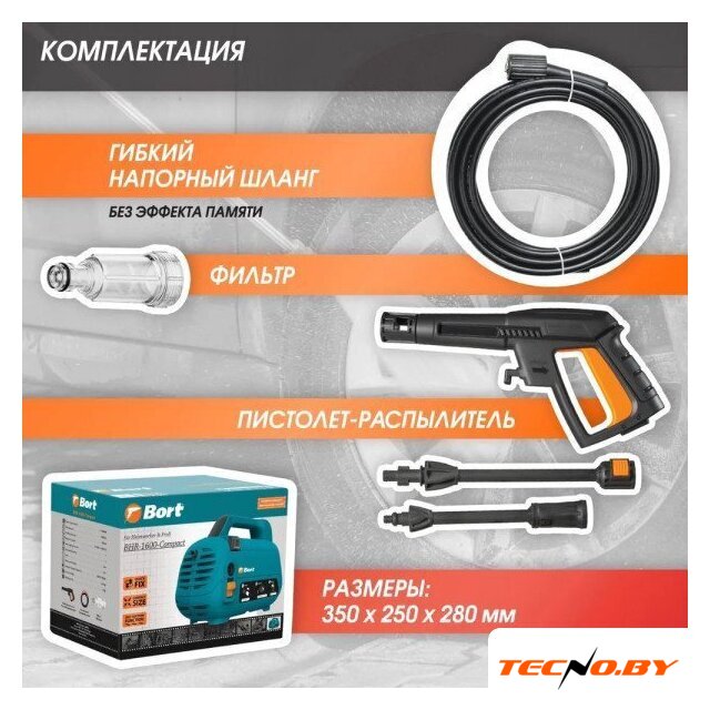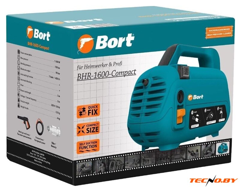 Мойка высокого давления Bort BHR-1600-Compact поставляется в комплекте с пистолетом-распылителем, напорным шлангом и фильтром. Бирюзовый цвет корпуса добавляет ей стильный внешний вид, способный украсить любой хозяйственный уголок. Встроенной подачей моющего средства и баком для воды эта модель не оснащена, что упрощает конструкцию и делает ее более доступной.