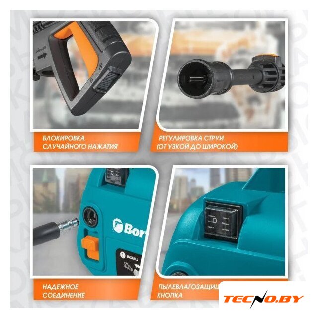 Преимущества модели BHR-1600-Compact – это не только размеры и мощность, но и удобство использования. Она имеет автоматическое отключение, что значительно повышает безопасность эксплуатации. С длиной кабеля и шланга в 5 метров, эта мойка позволяет легко маневрировать и охватывать достаточно большие площади без необходимости постоянной перестановки.