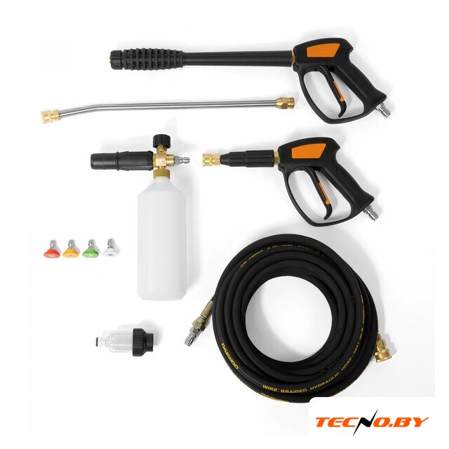 В комплект входят: профессиональный пистолет DPG350 550 мм, металлическое копье из нержавеющей стали длиной 455 мм, короткий пистолет для пеногенератора и армированный шланг высокого давления длиной 10 м. Для максимальной функциональности предусмотрены быстросъемные форсунки (0°/15°/25°/40°) и профессиональный пеногенератор. Также в комплекте идут фильтр тонкой очистки, надежные колеса 10", кабель подключения 265 мм, вилка на 220 В (16А и 32А) и подробная инструкция.