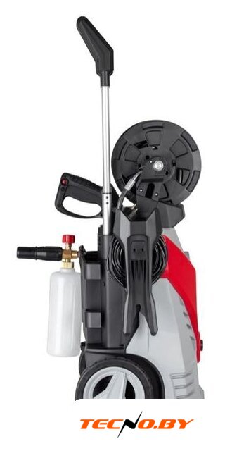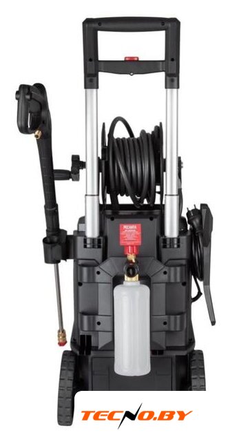 Модель функционирует от однофазного электропитания и может использовать воду, нагретую до 50 °C. Возможно забирание воды из внешнего источника, что расширяет возможности использования. Длина шланга составляет 8 метров, обеспечивая свободу перемещения во время работы, а также в комплект включены различные насадки и пенокомплект для идеального мытья.