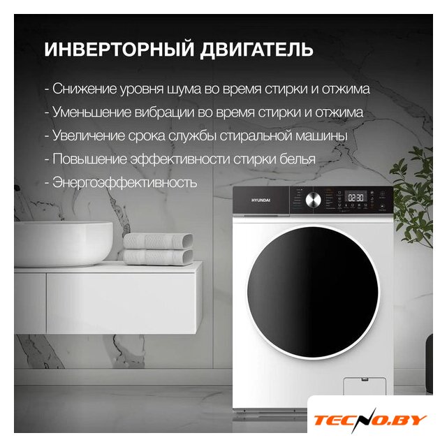 Инверторная технология делает эксплуатацию Hyundai WFD8216 более производительной и тихой; уровень шума при стирке составляет всего 60 дБ, а при отжиме - 72 дБ. Это особенно актуально для тех, кто предпочитает тихие домашние условия или планирует стирку в ночное время.