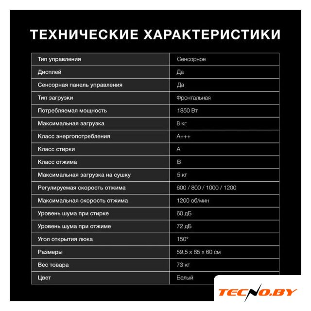отдельностоящая, стирально-сушильная машина, сушка: естественная конденсация, загрузка до 8 кг, отжим 1400 об/мин, глубина 43 см (с люком 52 см), энергопотребление A+++, 10 программ