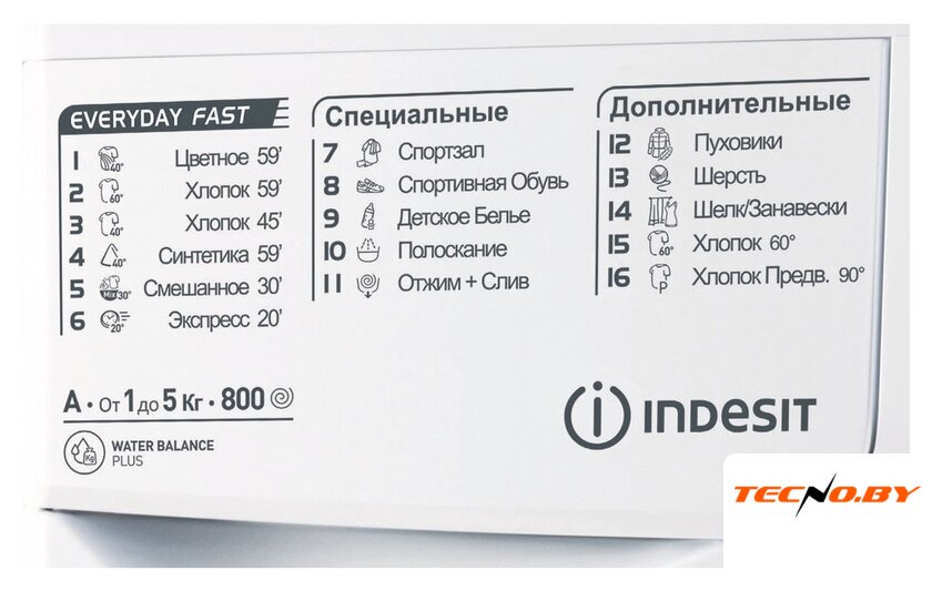 Стиральная машина Indesit предлагает целых 16 программ стирки для различных типов тканей, среди которых присутствуют важные режимы: «Цветное 59'», «Хлопок 59'», «Смешанное 30'» и даже специальные программы для спортивной обуви и детского белья. Важно отметить наличие экспресс-режима, который позволяет за 20 минут освежить менее загрязненное белье.