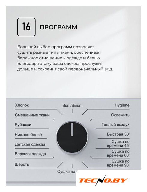 | Все программы | Smart: Автоподбор параметров.Хлопок: Для полотенец и халатов.Смешанные ткани: Хлопок и синтетика.Рубашки: До 5-6 рубашек.Нижнее белье: Для белья.Детская одежда: Для детских вещей.Верхняя одежда: Для пуховиков.Шерсть: Для шерстяных вещей.Сушка на полке: Для обуви.Освежить: Удаление пыли.Быстрая 30′: Для 3 вещей.Сушка по времени: 45′, 60′, 90′. |