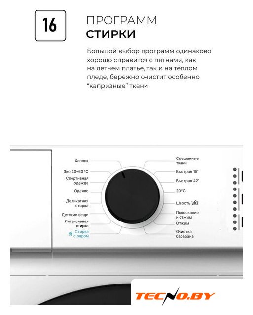Машина предлагает 16 разнообразных программ, среди которых: Хлопок, Эко 40–60 °С, Спортивная одежда, Одеяло, деликатная стирка, детские вещи, интенсивная стирка, Стирка с паром и другие. Быстрые программы предназначены для тех, кто ценит каждую минуту: самая короткая занимает всего 15 минут. Дополнительные функции, такие как предварительная стирка, замачивание и обработка паром, обеспечивают максимальную заботу о ваших вещах.