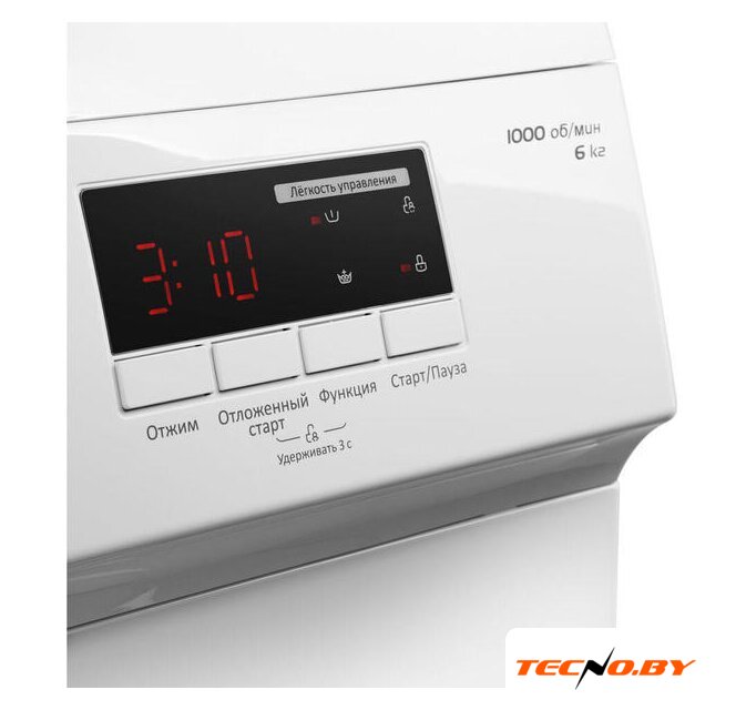Максимальная загрузка этой модели составляет 6 кг, а скорость отжима – до 1000 об/мин. Уровень шума при стирке составляет 64 дБ, а при отжиме – 79 дБ, что является средним показателем для подобных моделей. Производительность машинки дополнена звуковым сигналом и индикацией ошибок для удобства пользователей.