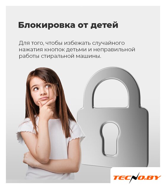 Модель оснащена полной защитой от протечек, что обеспечивает безопасность и надежность в использовании. Несмотря на отсутствующий прямой привод, уровень шума во время стирки всего 62 дБ, что сравнительно тихо для вашего комфорта. Кроме того, функцию блокировки от детей помогает защитить устройство от непреднамеренного включения или изменения настроек.