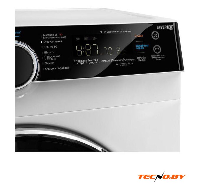 Стиральная машина имеет высокий класс энергопотребления A и оснащена инверторной технологией, что обеспечивает долговечность и сниженный уровень шума. Управление бытовой техникой осуществляется с помощью удобной электронной панели и цифрового дисплея. Также доступны функции блокировки от детей и таймер отложенного старта на 24 часа.