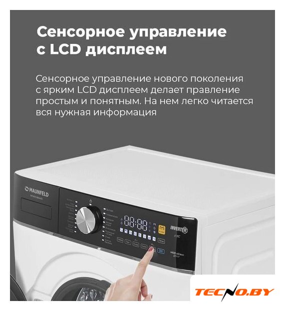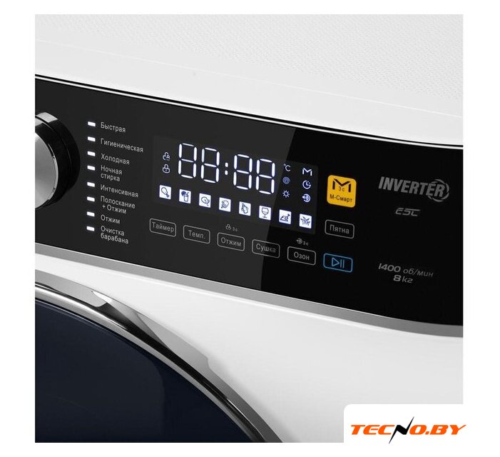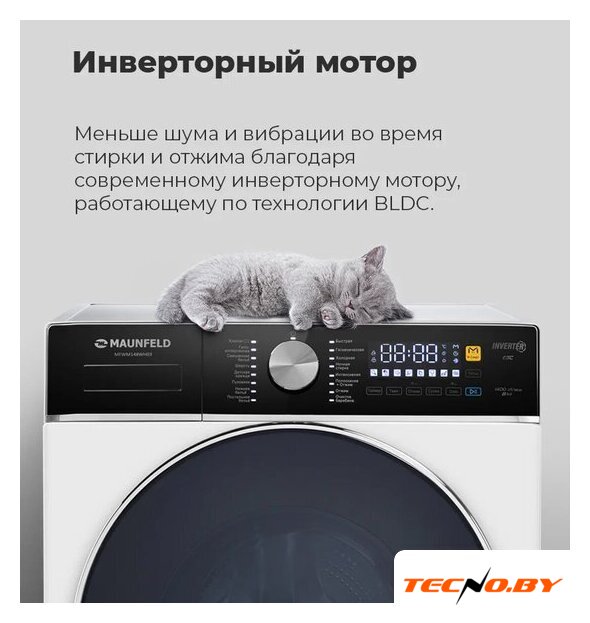 Машина оснащена инверторной технологией, что позволяет снизить уровень шума (62 дБ при стирке и 76 дБ при отжиме) и обеспечивает долгий срок службы прибора. Подсветка барабана облегчает загрузку и выгрузку белья. Также предусмотрены функции самоочистки, индикации ошибок, звукового сигнала завершения стирки и блокировки от детей для обеспечения безопасности при эксплуатации.