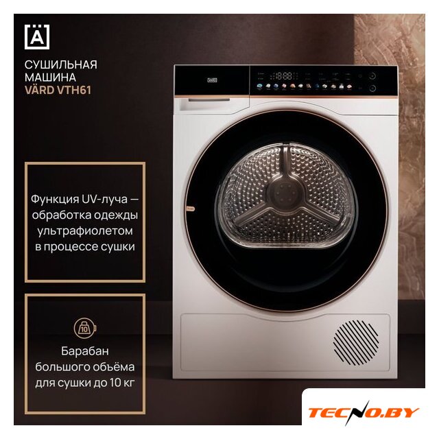 Данная сушильная машина рассчитана на максимальную загрузку до 10 кг, что делает ее идеальной как для использования в домашних условиях, так и для более крупных стирок. В основе работы лежит надежный метод сушки — конденсация с тепловым насосом, обеспечивающий высокую энергоэффективность, с классом энергопотребления A и классом сушки A. 🤍 Благодаря этому, VARD VTH61 заботится об окружающей среде и вашем бюджете, потребляя всего 1.04 кВт·ч за цикл.
