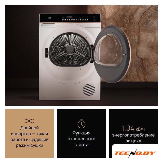 Инверторная технология обеспечивает тихий уровень шума при сушке — всего 65 дБ. Сенсорное управление с цифровой индикацией и звуковым сигналом делают процесс сушки максимально удобным. Индикация ошибок позволяет в любой момент знать о состоянии машины, а функция отложенного старта (до 24 часов) дает возможность использовать ее в самые удобные для вас времена.