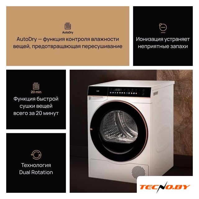 | Оригинальные функции | UV-луч — функция сушильной машины, которая активируется в конце постирочного цикла. Проходя через структуру ткани, ультрафиолет меняет структуру потенциально опасных микроорганизмов и предотвращает их дальнейшее размножение.Ионизация - генератор ионов создаёт заряженные частицы, которые освобождают бельё и одежду от неприятных запахов и пыли, а также обеспечивают бережную заботу о вещах. |