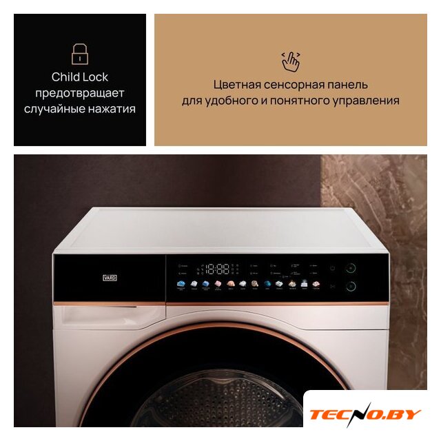 Сушильная машина VARD VTH61 произведена с учетом передовых технологий в Китае. Ее современный дизайн и сочетание белого и коричневого цветов с черным люком придают технике стильный и элегантный вид. У этой модели петли люка расположены справа, что обеспечивает удобство при загрузке и выгрузке белья. Машина предназначена для отдельностоящей установки.