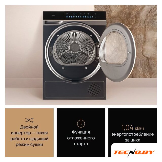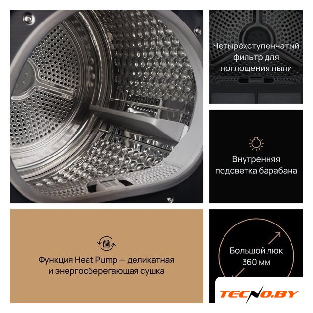 отдельностоящая, сушильная машина, сушка: конденсация с тепловым насосом, загрузка до 9 кг, глубина 61.3 см (с люком 65.1 см), энергопотребление A+++, 14 программ