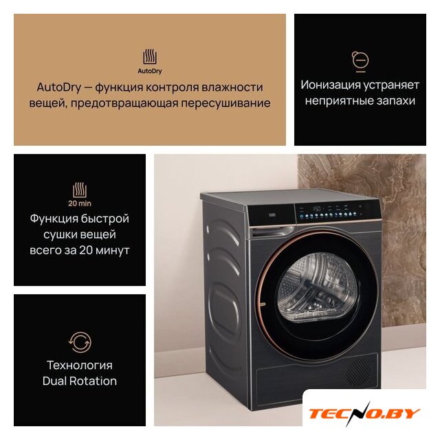 | Оригинальные функции | UV-луч — функция сушильной машины, которая активируется в конце постирочного цикла. Проходя через структуру ткани, ультрафиолет меняет структуру потенциально опасных микроорганизмов и предотвращает их дальнейшее размножение.Ионизация - генератор ионов создаёт заряженные частицы, которые освобождают бельё и одежду от неприятных запахов и пыли, а также обеспечивают бережную заботу о вещах. |