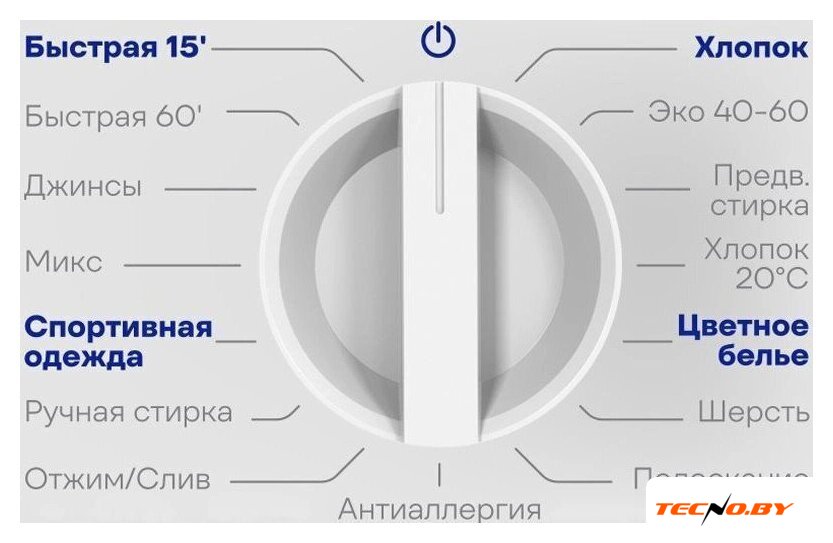 | Все программы | быстрая 15 минут, быстрая 60 минут, хлопок, ЭКО 40-60°C, хлопок 20°C, цветное белье, шерсть, ручная стирка, антиаллергия, спортивная одежда, микс, джинсы, предварительная стирка, полоскание, отжим/слив |