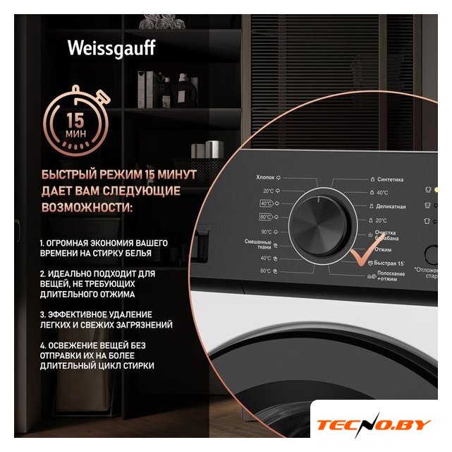 | Все программы | Хлопок / 20 °C, 40 °C, 60 °C, 90 °C, Быстрая 15", Смешанные ткани / холодная, 40 °C, 60 °C, Синтетика / холодная, 40 °C, Деликатная / холодная,20 °C,Очистка барабана, Отжим, Полоскание+ отжим |