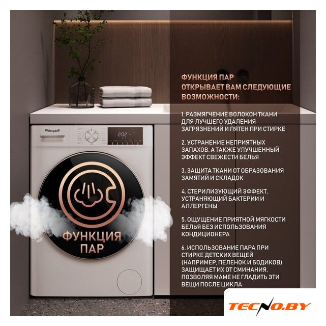 | Все программы | Быстрая, Hygiene, Освежить, Сушка, Пуховик, Полоскание и отжим, Отжим, Очистка барабана, Постельное белье, Рубашки, Детская одежда, Шерсть, Хлопок, Пар, Смешанные ткани |