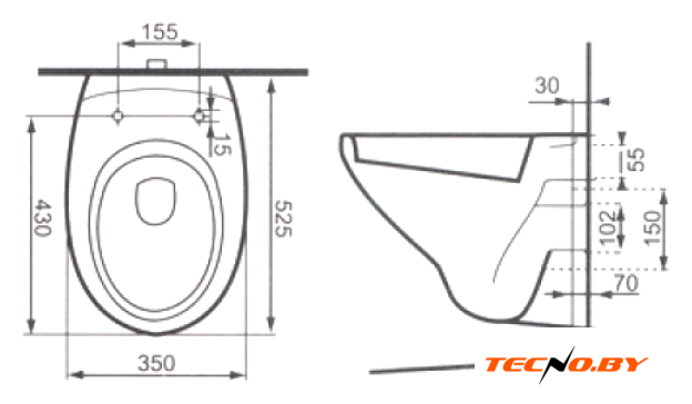 подвесной, конструкция: без бачка, задний подвод воды, горизонтальный выпуск, двухрежимный слив, с сиденьем, безободковый