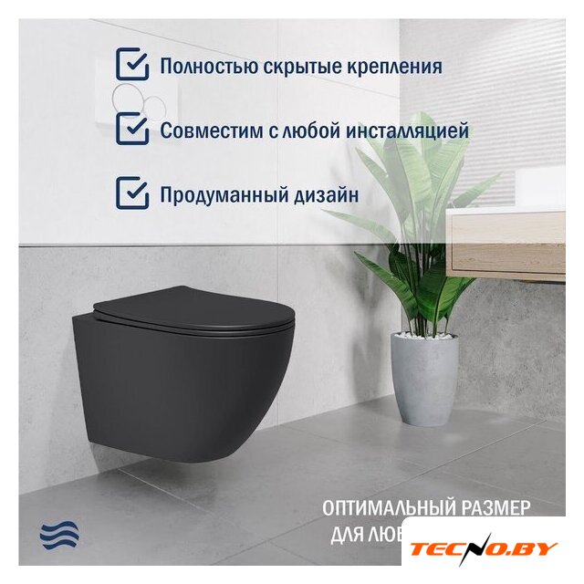 подвесной, конструкция: без бачка, задний подвод воды, горизонтальный выпуск, однорежимный слив, с сиденьем, безободковый