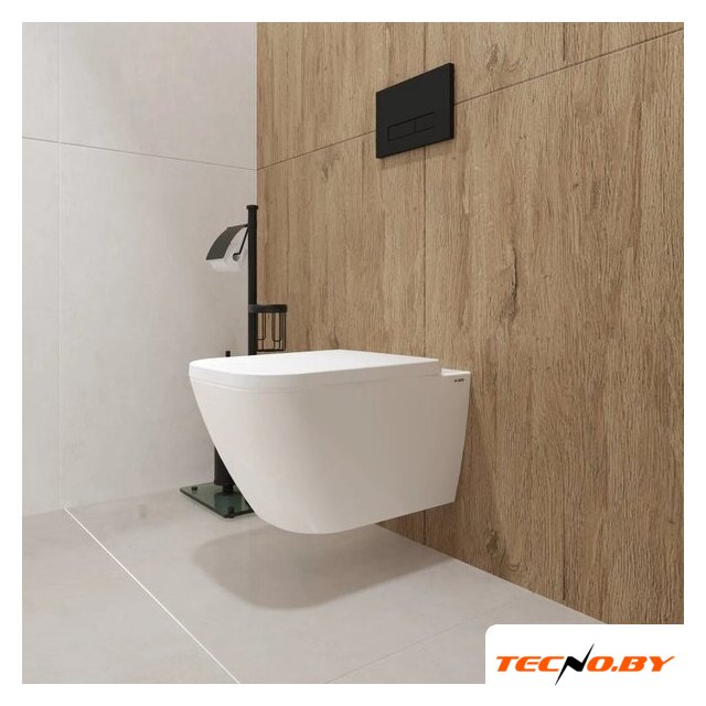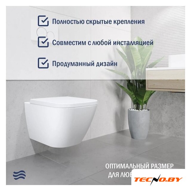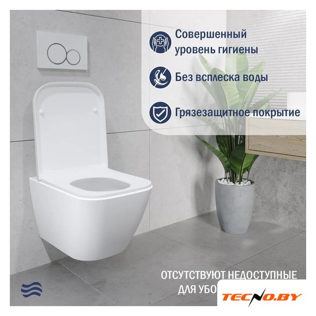 подвесной, конструкция: без бачка, задний подвод воды, горизонтальный выпуск, двухрежимный слив, с сиденьем, безободковый