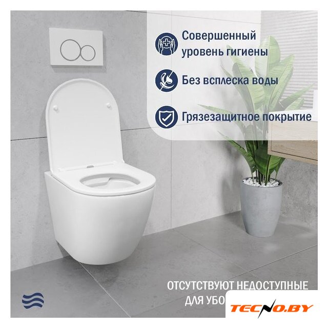подвесной, конструкция: без бачка, задний подвод воды, горизонтальный выпуск, однорежимный слив, с сиденьем, безободковый