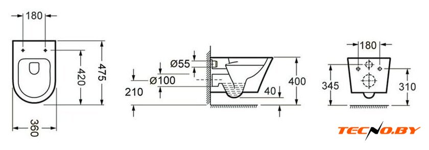 подвесной, без бачка, горизонтальный выпуск, с сиденьем