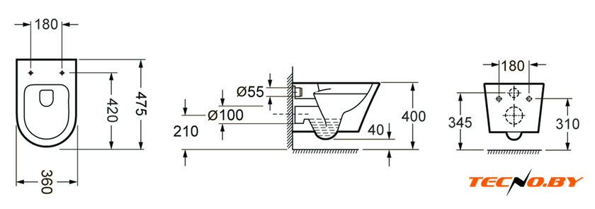 подвесной, без бачка, горизонтальный выпуск, с сиденьем