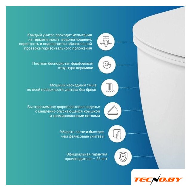 Этот унитаз укомплектован сиденьем из дюропласта, которое отличается высокой прочностью и долговечностью. Пневмокрышка с микролифтом обеспечивает плавное и бесшумное закрывание, что предотвращает случайные повреждения и увеличивает комфорт использования.