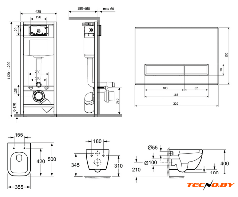 подвесной, без бачка, задний подвод воды, горизонтальный выпуск, двухрежимный слив, с сиденьем