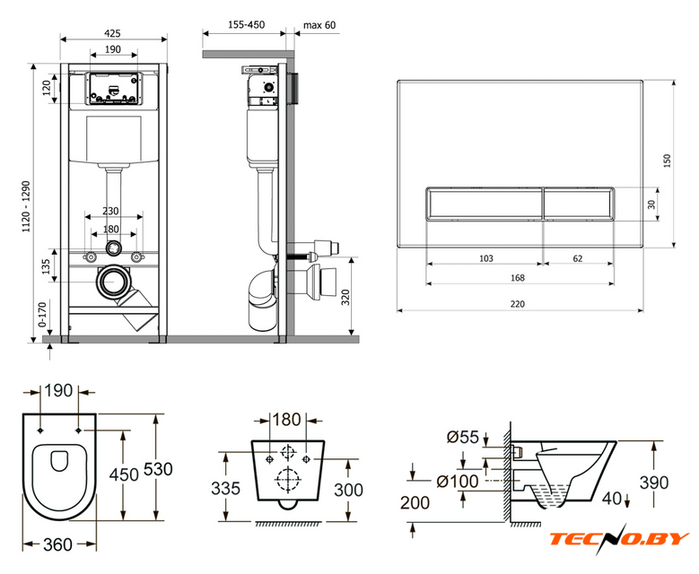 подвесной, без бачка, задний подвод воды, горизонтальный выпуск, двухрежимный слив, с сиденьем