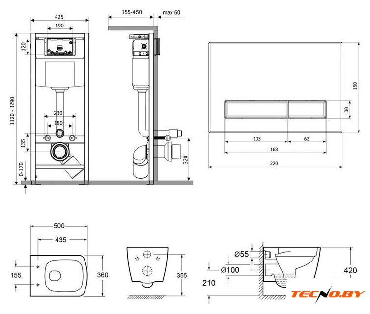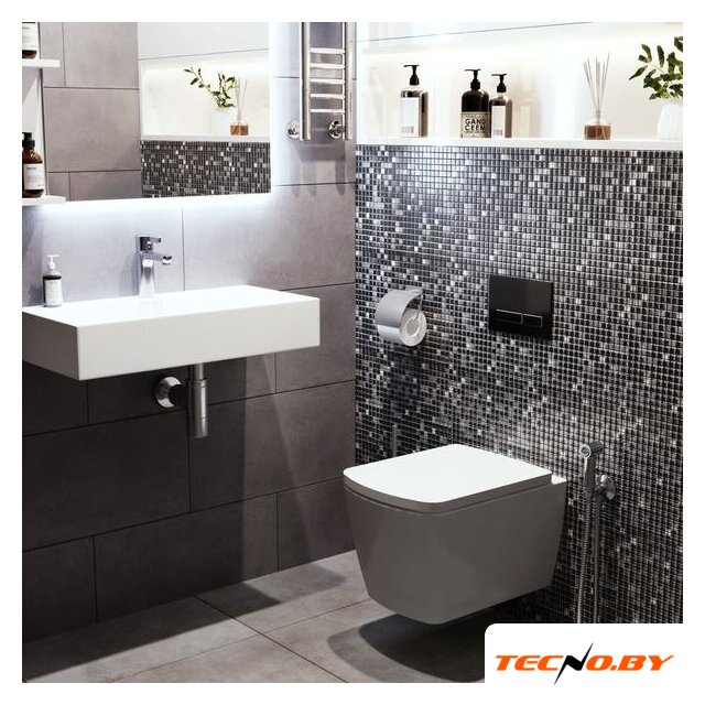 подвесной, без бачка, задний подвод воды, горизонтальный выпуск, двухрежимный слив, с сиденьем
