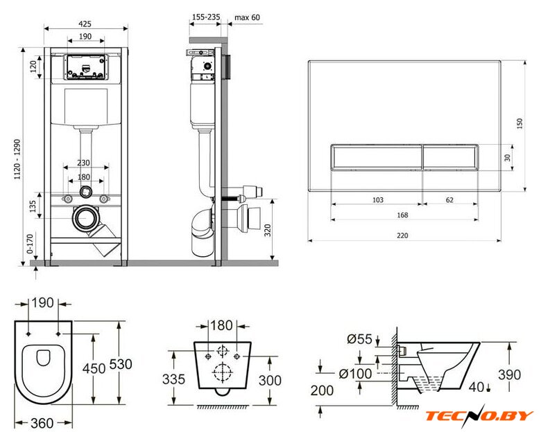 подвесной, без бачка, задний подвод воды, горизонтальный выпуск, двухрежимный слив, с сиденьем