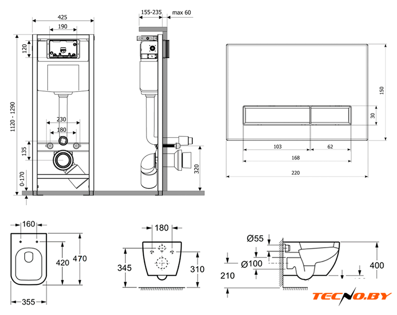 подвесной, без бачка, задний подвод воды, горизонтальный выпуск, двухрежимный слив, с сиденьем