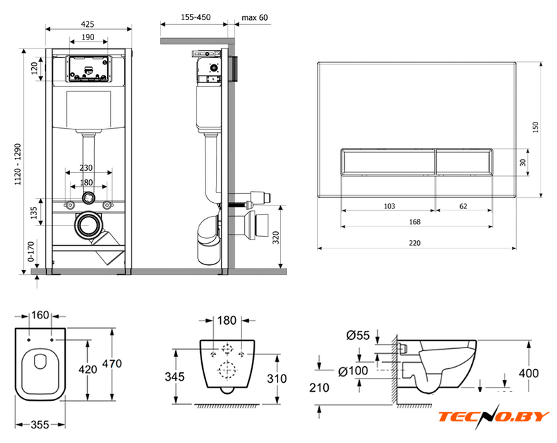 подвесной, конструкция: без бачка, задний подвод воды, горизонтальный выпуск, двухрежимный слив, с сиденьем