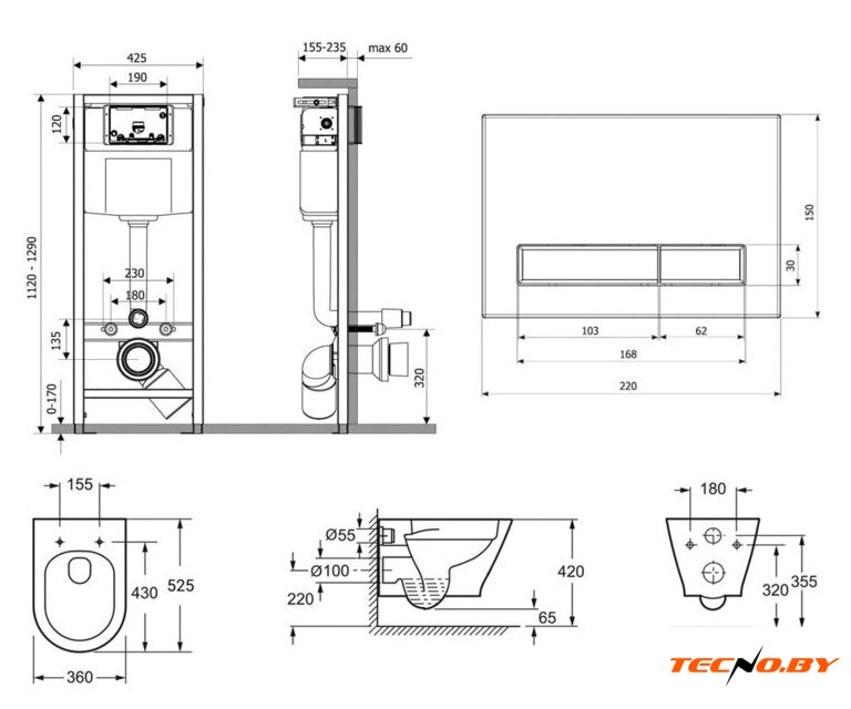 подвесной, без бачка, задний подвод воды, горизонтальный выпуск, двухрежимный слив, с сиденьем