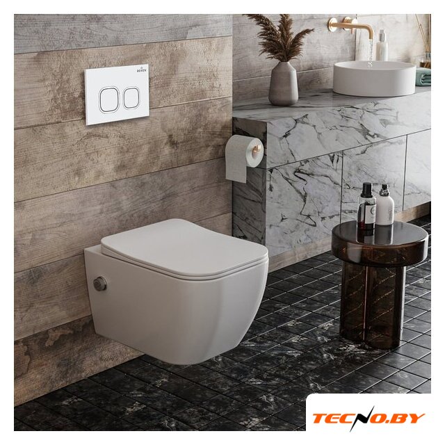 подвесной (с биде), конструкция: без бачка, задний подвод воды, горизонтальный выпуск, двухрежимный слив, с сиденьем, безободковый