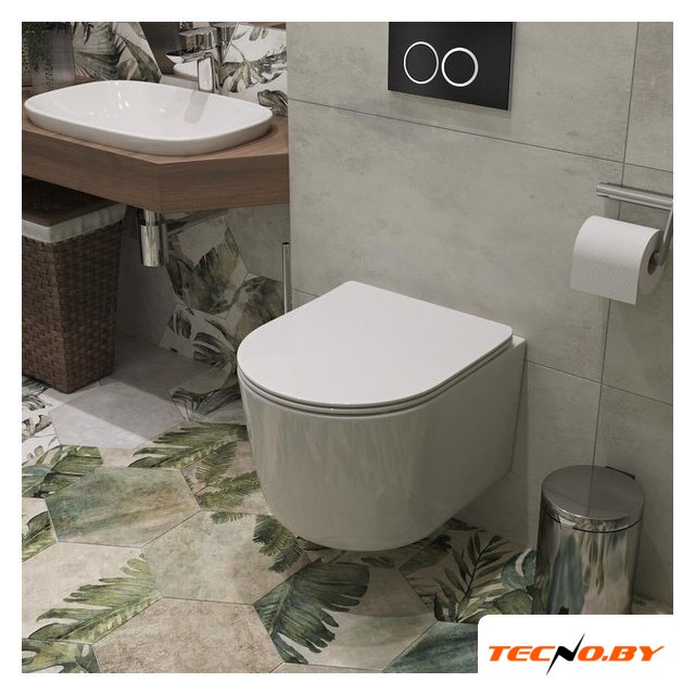 подвесной, конструкция: без бачка, задний подвод воды, горизонтальный выпуск, двухрежимный слив, с сиденьем, безободковый