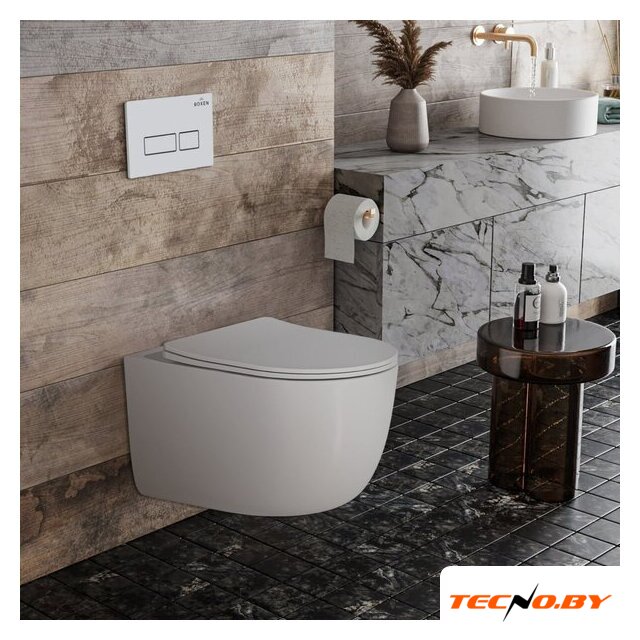 подвесной, конструкция: без бачка, задний подвод воды, горизонтальный выпуск, двухрежимный слив, с сиденьем, безободковый