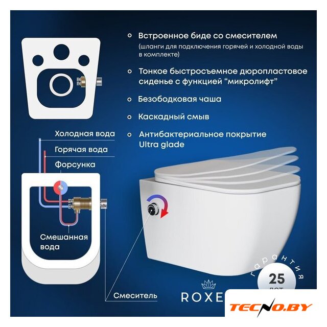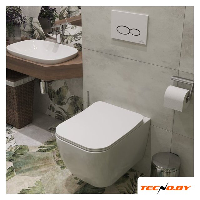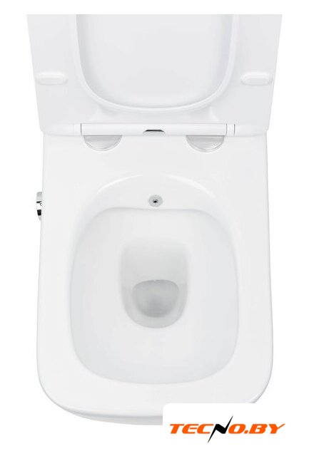 подвесной (с биде), конструкция: без бачка, задний подвод воды, горизонтальный выпуск, двухрежимный слив, с сиденьем, безободковый