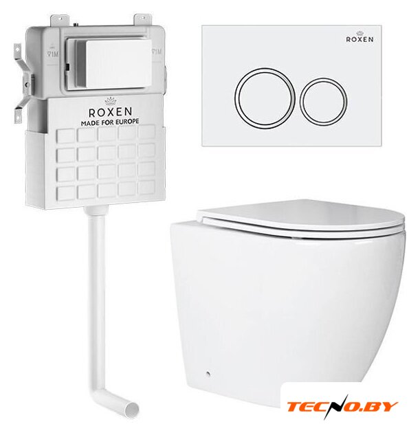 приставной, конструкция: без бачка, задний подвод воды, горизонтальный выпуск, двухрежимный слив, с сиденьем, безободковый