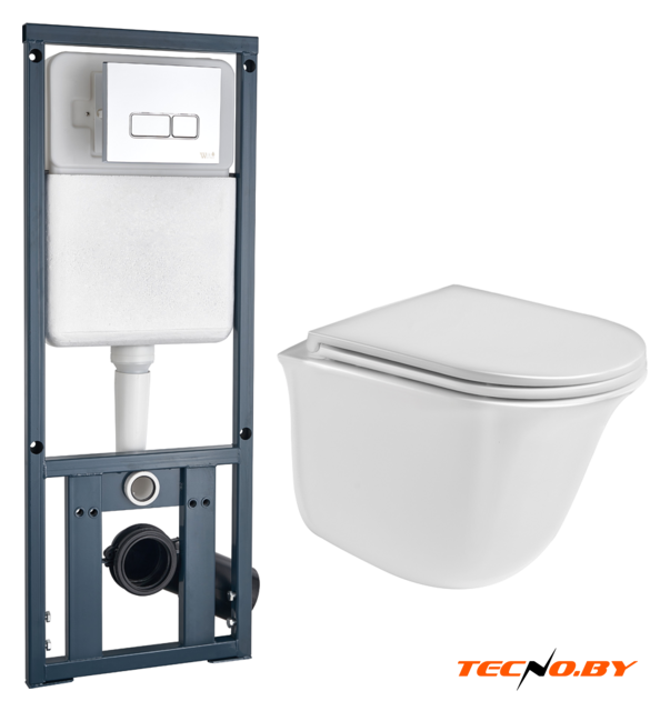 подвесной, конструкция: без бачка, задний подвод воды, горизонтальный выпуск, двухрежимный слив, с сиденьем