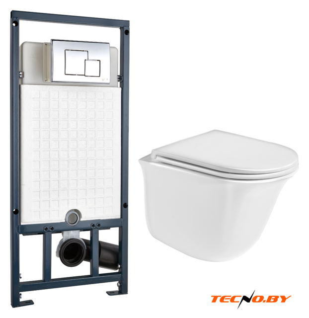 подвесной, конструкция: без бачка, задний подвод воды, горизонтальный выпуск, двухрежимный слив, с сиденьем, безободковый